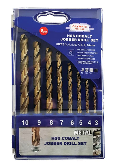 HSS Cobalt Twist Drill Set comprises 8 fully ground flute drill bits, ranging from 3mm to 10mm, offering precision for various drilling tasks.