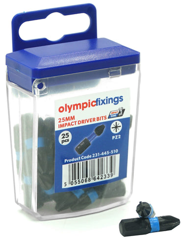 Impact Driver Bit Set No 2 1" Pozi contains a Tic Tac of 25 high-quality S2 tool grade steel tips, with a standard _Ó hexagonal shank, and suitable for use with impact drivers.
