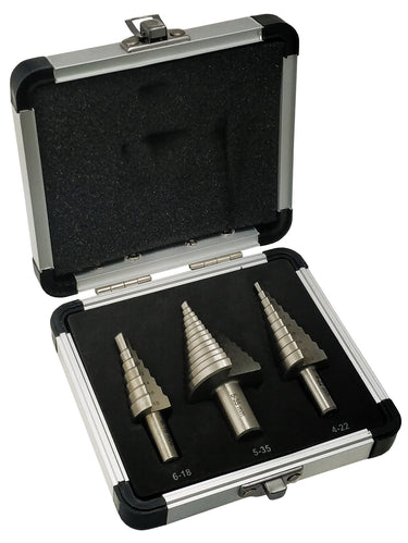 HSS Step Drill 3 Piece Set includes three high-speed steel step drills sized 6-18mm, 4-22mm, and 5-35mm. Purposed for drilling varying hole sizes in metal, plastic or wood.