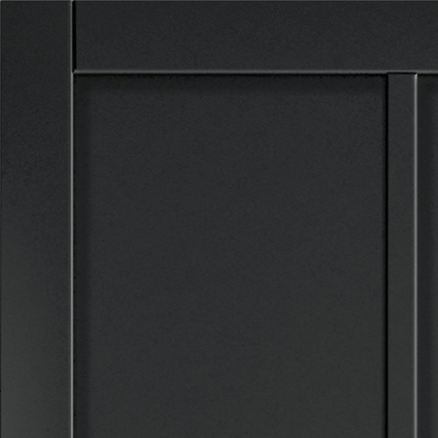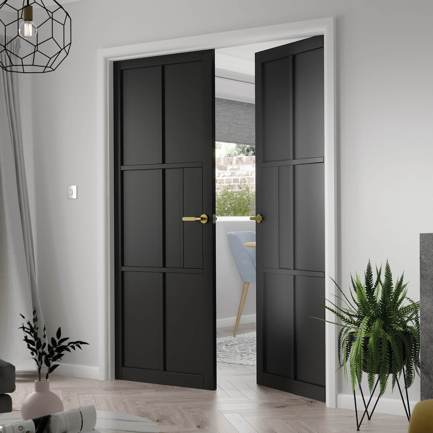 Civic Black Door showcases a modern black industrial style with recessed panels, pre-finished for convenience.